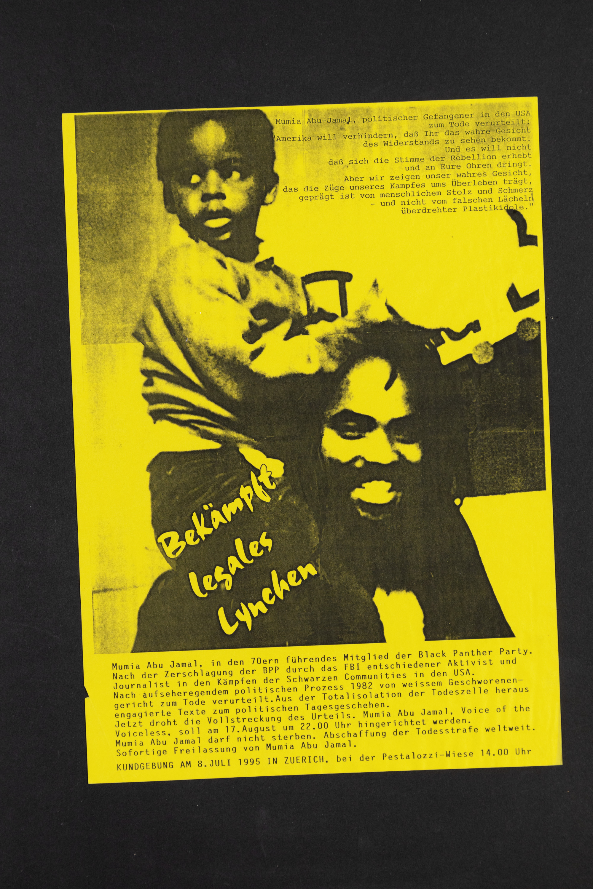Sofortige Freilassung von Mumia Abu-Jamal. Kundgebung am 8. Juli 1995 in Zürich, bei der Pestalozzi-Wiese, 14.00 Uhr