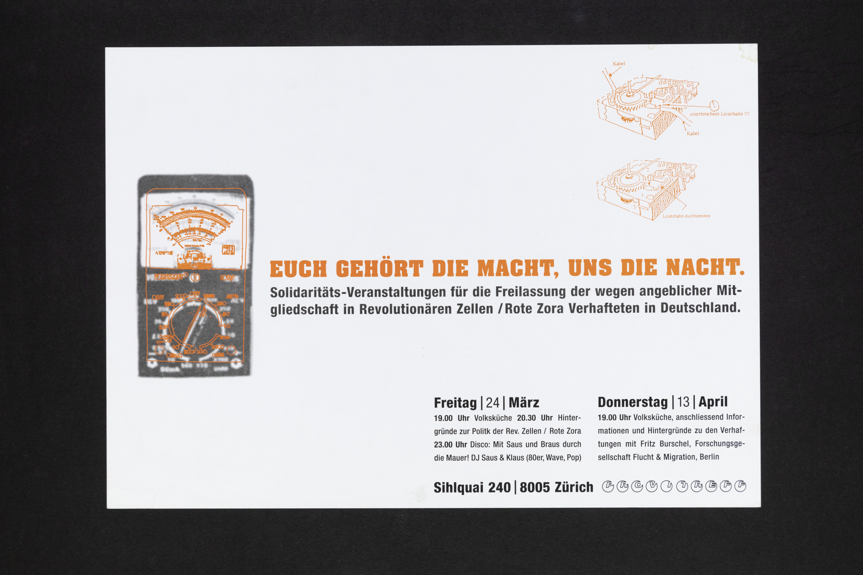 Euch gehört die Macht, uns die Nacht. Solidaritätsveranstaltungen für die Freilassung der wegen angeblicher Mitgliedschaft in Revolutionären Zellen / Rote Zora Verhafteten in Deutschland