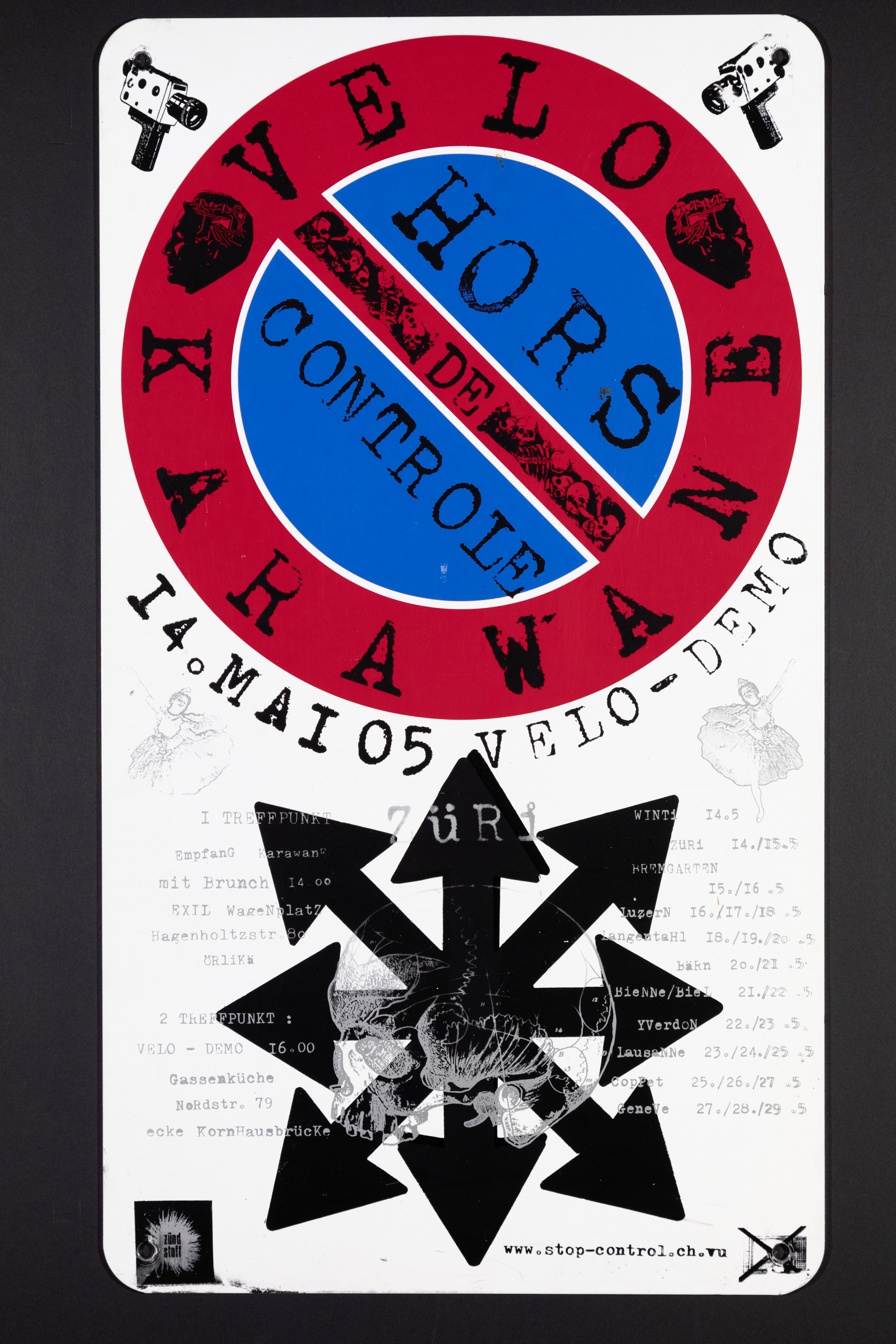 Dokument 17 - Hors de Controle. Velokarawane durch die Schweiz. Velodemo in Zürich. Besammlung Gassenküche (Verkehrstafel)
