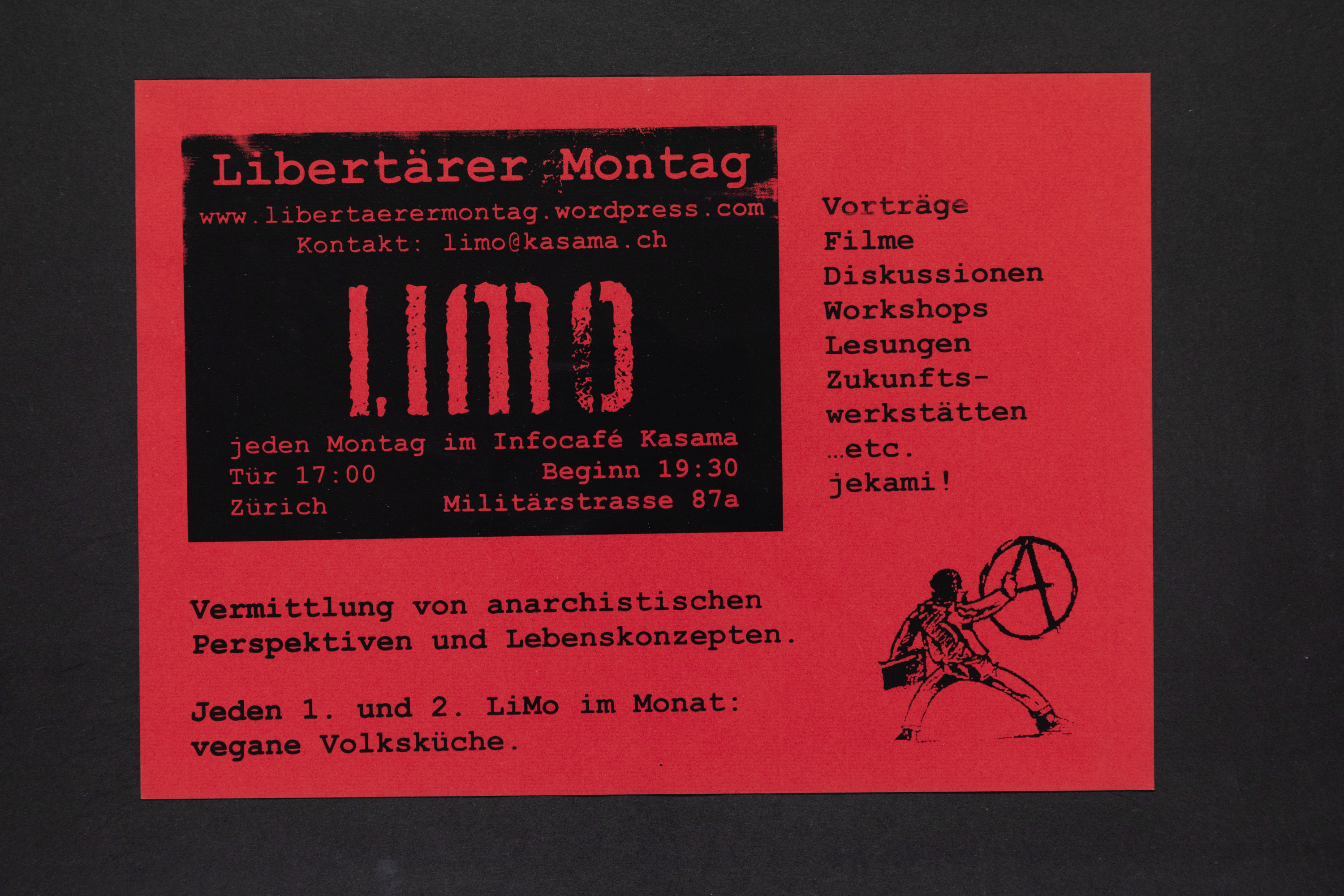 LiMo. Libertärer Montag. Vorträge. Filme. Diskussionen. Vermittlung von anarchistischen Perspektiven und Lebenskonzepten. Jeden Montag im Infocafé Kasama