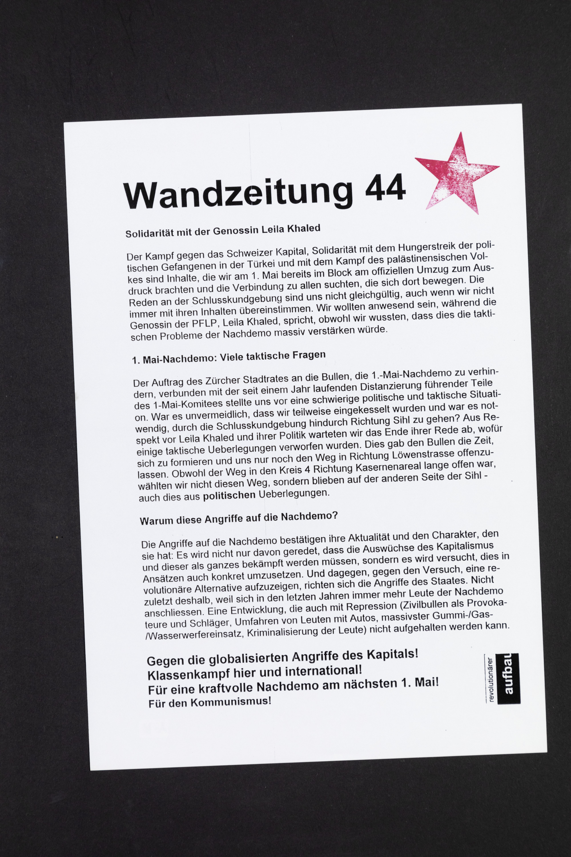 Wandzeitung 44. Solidarität mit der Genossin Leila Khaled. 1. Mai-Nachdemo: Viele taktische Fragen